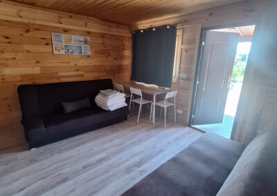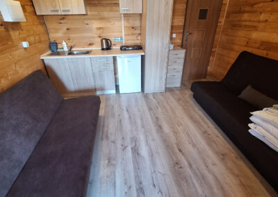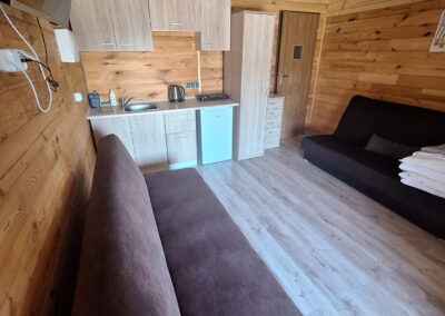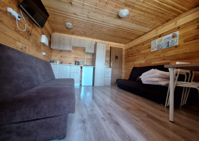 Dwie rozkładane sofy, telewizor, stół jadalny z krzesłami – wszystko co potrzebne do komfortowego wypoczynku dla 4 osób.