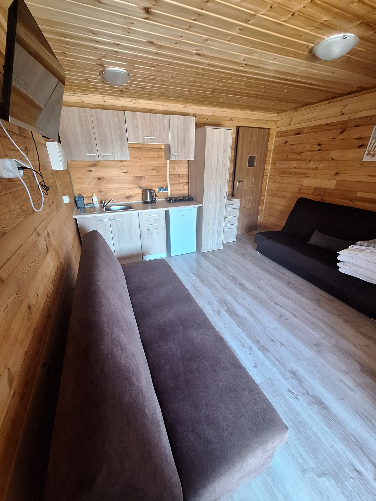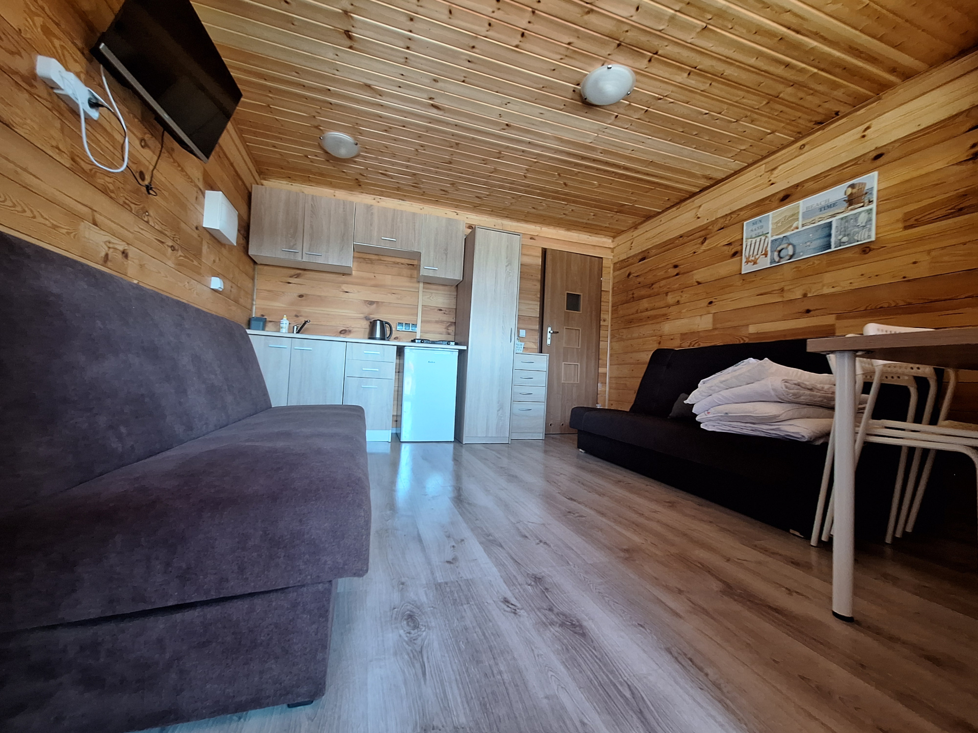 Dwie rozkładane sofy, telewizor, stół jadalny z krzesłami – wszystko co potrzebne do komfortowego wypoczynku dla 4 osób.